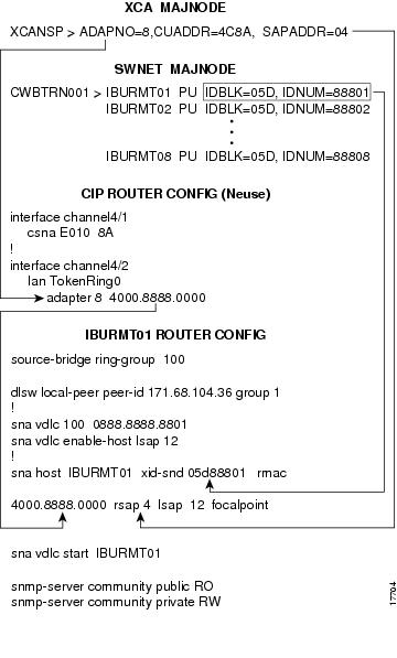 provides a diagram of a sample VTAM configuration and its corresponding router configuration. If you are using a CIP CSNA connection to the host, then external communication adapter (XCA) definitions are needed (file XCANSP). Use SWNET definitions in VTAM (file CWBTRN001) to define the routers as switched PUs on the host.