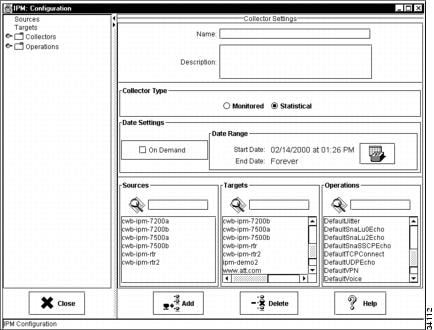 When you start IPM for the first time, the IPM Main window contains no collectors. As you configure collectors, they are displayed in this window. Each collector is a combination of a configured source, a target, and an operation. For each collector, you specify parameters for gathering statistics, generating event notifications, and scheduling.