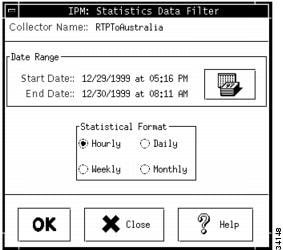 In this window, you specify the time period for which you want to view statistics. You can view statistics for all or part of the time that the data was collected. When this window is displayed, by default the start date is set to the starting date for the collector and the end date is set for one day from the start date.
