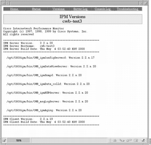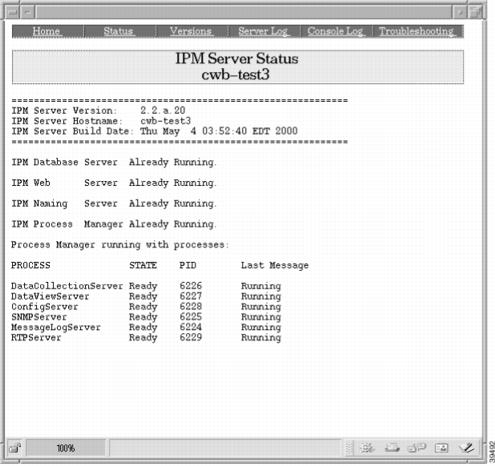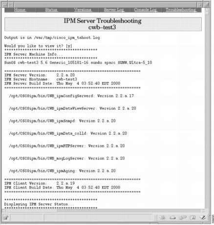 When troubleshooting problems with IPM, you can view useful information from either the CiscoWorks2000 desktop or the IPM Server Home Page. The following sections provide details on pertinent information: