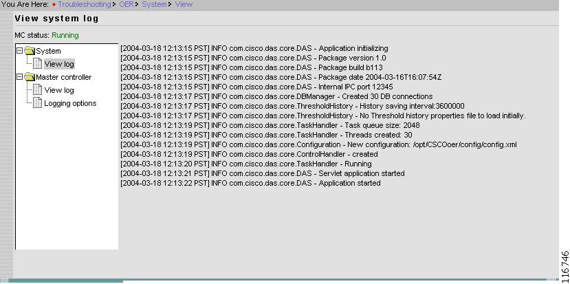 System log contains the messages pertaining to overall system. This yields logging of the Cisco OER Master Controller Engine startup, start, and stop activity.