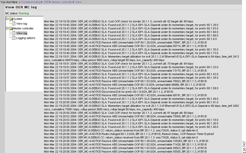 The Master Controller log contains the error and debugging messages for Cisco OER Master Controller Engine operations.