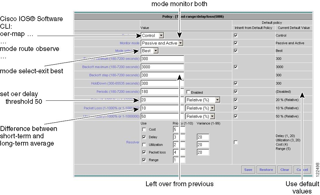 Figure 2-6 shows Policy configurations and various parameters as entered in CLI and selected on the Cisco OER Master Controller Engine GUI.