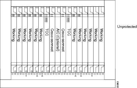 Unprotected cards are not included in a protection scheme; therefore, a card failure or a signal error results in lost data. Because no bandwidth lies in reserve for protection, unprotected schemes maximize the available ONS 15454 bandwidth. Figure 6-3 shows the ONS 15454 in an unprotected configuration. All cards are in a working state.