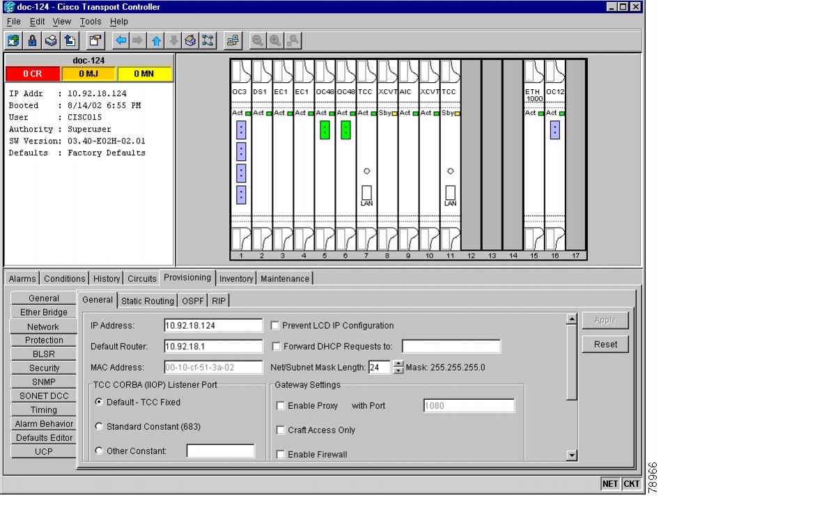 If you enable Enable Firewall, always check Enable Proxy. If Enable Proxy is not enabled, CTC will not be able to see nodes on the DCC side of the ONS 15454.