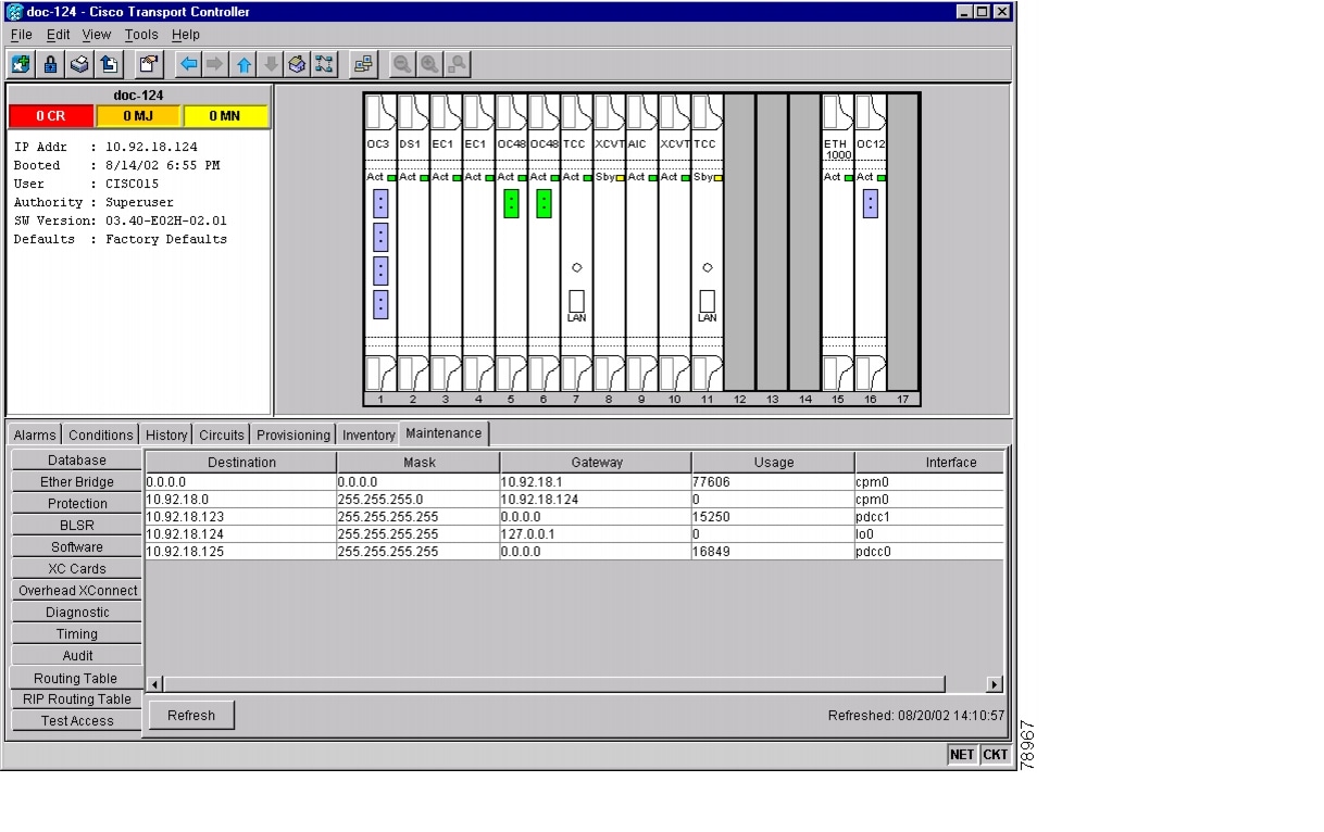 ONS 15454 routing information is displayed on the Maintenance > Routing Table tabs (Figure 11-13). The routing table provides the following information:
