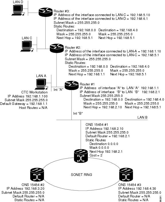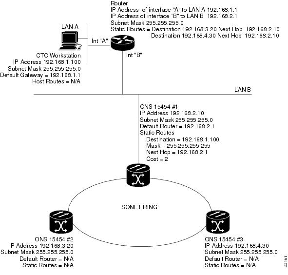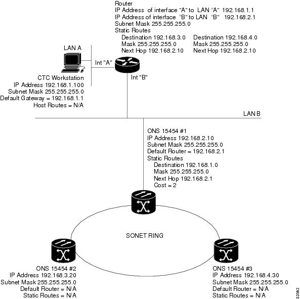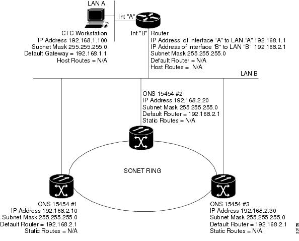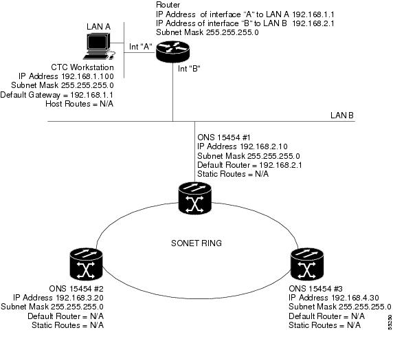 In Scenario 2 the CTC computer resides on a subnet (192.168.1.0) and attaches to LAN A (Figure 11-2). The ONS 15454s reside on a different subnet (192.168.2.0) and attach to LAN B. A router connects LAN A to LAN B. The IP address of router interface A is set to LAN A (192.168.1.1), and the IP address of router interface B is set to LAN B (192.168.2.1).
