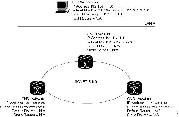 This scenario assumes all CTC connections are to ONS 15454 #1. If you connect a laptop to either ONS 15454 #2 or #3, network partitioning will occur; neither the laptop or the CTC computer will be able to see all nodes. If you want laptops to connect directly to end network elements, you will need to create static routes (see Scenario #5) or enable the ONS 15454 proxy server (see Scenario #7).