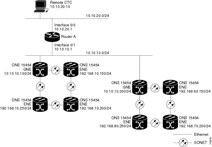 Figure 11-11 shows the same proxy server implementation with ONS 15454 ENEs on different subnets. Figure 11-12 shows the implementation with ONS 15454 ENEs in multiple rings. In each example, ONS 15454 GNEs and ENEs are provisioned with the settings shown in Table 11-2.
