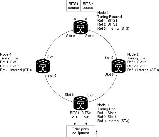 Figure 8-1 shows an ONS 15454 network timing setup example. Node 1 is set to external timing. Two timing references are set to BITS. These are Stratum 1 timing sources wired to the BITS input pins on the Node 1 backplane. The third reference is set to internal clock. The BITS output pins on the backplane of Node 3 are used to provide timing to outside equipment, such as a Digital Access Line Access Multiplexer.
