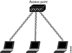 In an all-wireless network, an access point acts as a stand-alone root unit. The access point is not attached to a wired LAN; it functions as a hub linking all stations together. The access point serves as the focal point for communications, increasing the communication range of wireless users. Figure 2-2 shows an access point in an all-wireless network.