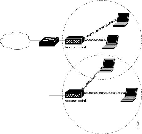 An access point connected directly to a wired LAN provides a connection point for wireless users. If more than one access point is connected to the LAN, users can roam from one area of a facility to another without losing their connection to the network. As users move out of range of one access point, they automatically connect to the network (associate) through another access point. The roaming process is seamless and transparent to the user. Figure 2-1 shows access points acting as root units on a wired LAN.
