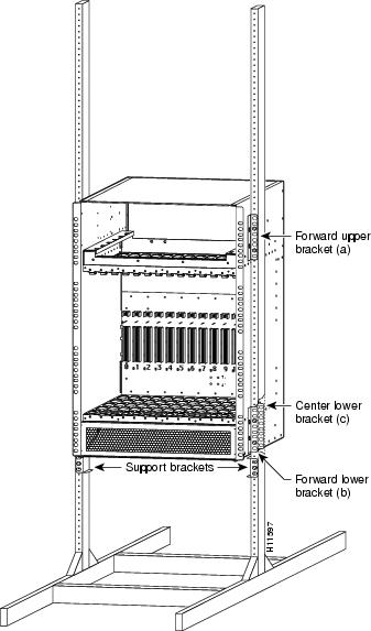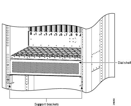 There is no clearance requirement for mounting the router shelf directly above the dial shelf. Use the rack-mounting brackets and cable-management kit that shipped with the Cisco 7206 router shelf to install the router in the rack.