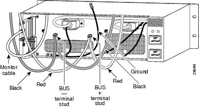 Attach two black DC-interconnect power-cable ring lugs to the terminal stud labeled BUS - on the AC power shelf chassis rear. (Refer to Figure 3-1.)