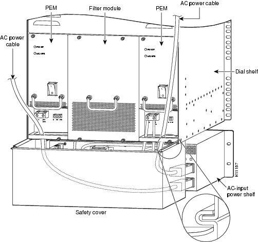 This section explains how to attach the power cables and rack-mount the AC-input power shelf. For detailed cabling specification tables, refer to Appendix A, "Cisco AS5800 Specifications."