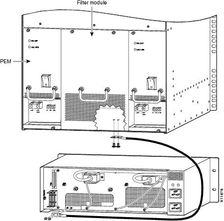 Feed the rectangular ends of the AC power cords through the spaces in the DC PEMs as shown in Figure 3-18.