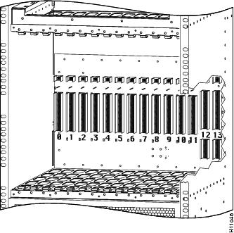 The Cisco 5814 dial shelf contains 14 slots (numbered 0 to 13 on the backplane) and can support as many as 10 modem cards, 2 T3 or 4 T1 trunk cards, and 2 dial shelf controllers (DSCs). Slots 12 and 13 in the dial shelf are dedicated slots for the DSCs. Metal guard pins on the backplane module prevent you from installing any other type of card in these two slots. The modular chassis supports online insertion and removal (OIR) and redundant power and includes environmental monitoring and feedback control.