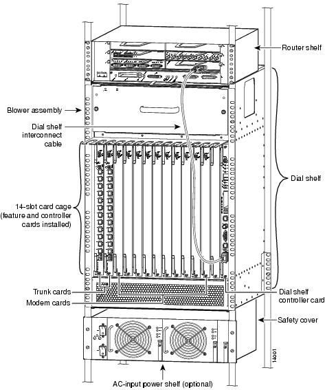 The dial shelf and router shelf are bundled, and can be ordered to support either AC or DC power. Included in the dial shelf is a blower assembly, filter module, and DC-input power entry modules (PEMs). Also included in the bundled system are ingress trunk cards, modem cards, dial shelf controller cards, Flash memory PCMCIA cards, cables, and Cisco IOS software. The dial shelf feature cards and host router shelf communicate via a dial shelf interconnect cable.
