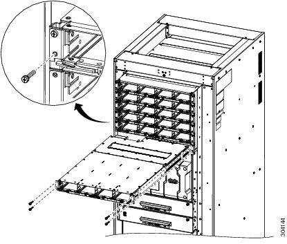 Remove the lower horizontal bracket (below the FC and RP card cage) by loosening and removing the four pan-head screws.