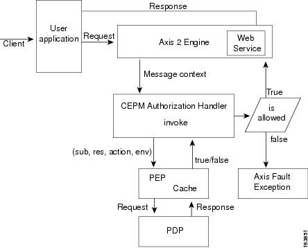 The Axis2 CEPM Handler operates as an authorization module to protect any Axis2 web services. The handler is inserted in the request flow of a web application, in front of any resource, that requires authorization protection. The handler examines every incoming Simple Object Access Protocol (SOAP) request. It extracts the required information from the MessageContext, makes a CEPM PEP call, and receives back the result of the authorization operation.
