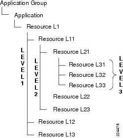 All the nodes (levels) and component objects (resources) must be identified and each of them should be linked in a tree structure. The object (Resource L1) must be referenced to the application group and application. (See the example for sample resource creation.)