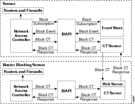 A Network Access Controller is run on every sensor. Each Network Access Controller subscribes to network access events from its local Event Store. The Network Access Controller configuration contains a list of sensors and the network access devices that its local Network Access Controller controls. If a Network Access Controller is configured to send network access events to a master blocking sensor, it initiates a network access control transaction to the remote Network Access Controller that controls the device. These network access action control transactions are also used by IPS managers to issue occasional network access actions.