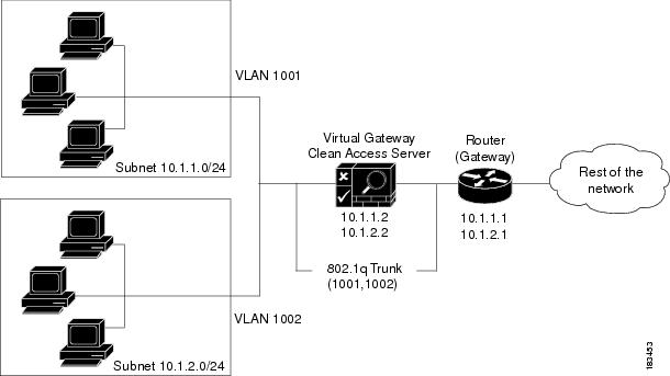 For example, if there are two untrusted subnets, 10.1.1.0/24 and 10.1.2.0/24, with gateways 10.1.1.1 and 10.1.2.1, respectively, the CAS in Virtual Gateway mode is deployed between the untrusted subnets and their gateways (Figure 2-2). The untrusted subnets are configured as "Managed Subnets" in the CAS. Note especially that: