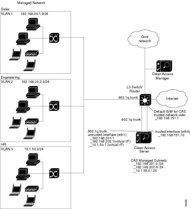 In a VLAN-enabled environment, multiple VLANs are trunked through a single Clean Access Server. Aggregating multiple VLANs—organized by location, wiring, or shared needs of users—through a single CAS (by VLAN trunking) can help to simplify your deployment. Figure 2-3 shows a centrally-routed deployment: