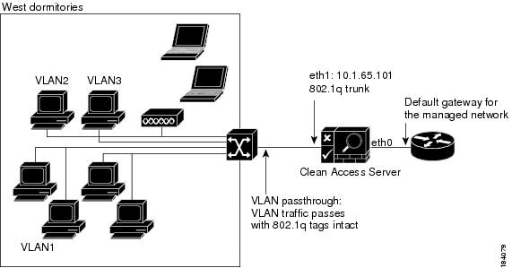 To ensure that no path exists from the clients to the gateway, Cisco recommends deploying a switch that aggregates all VLANs to the untrusted interface of the CAS, while the trusted interface of the CAS is directly connected to the L3 switch or the router, as shown in Figure 2-4. Note that the Clean Access Server interfaces will be connected to trunked ports and should provide VLAN passthrough.