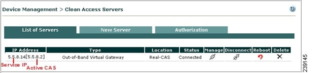 From the Clean Access Manager administrator web console, go to Device Management > CCA Servers and wait for the secondary Clean Access Server to become active. (Note that this can take a few minutes.) The active CAS of a high-availability pair is displayed in brackets next to the Service IP for the pair, as shown in Figure 4-9. The IP address of the secondary CAS should appear in brackets in the List of Servers with a status of Connected.