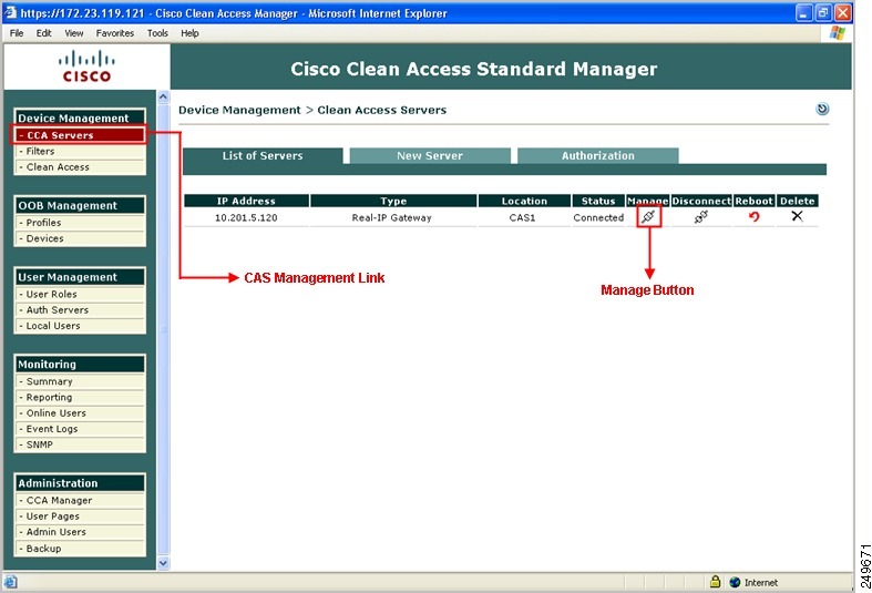 From the CAM web admin console, go to Device Management > CCA Servers.