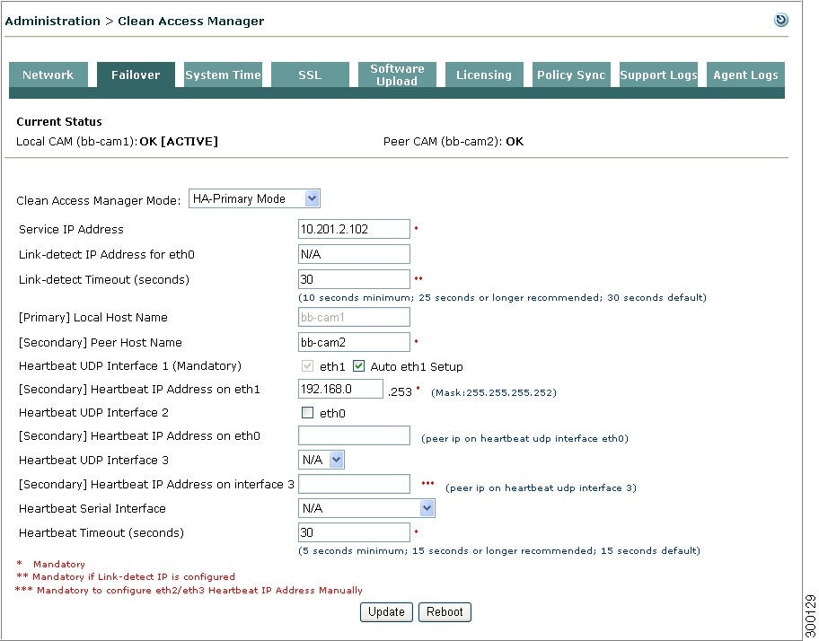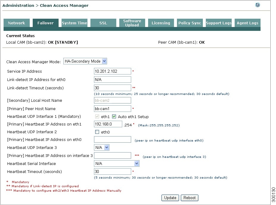 Warning To prevent any possible data loss during database synchronization, always make sure the standby (secondary) Clean Access Manager is up and running before failing over the active (primary) Clean Access Manager.
