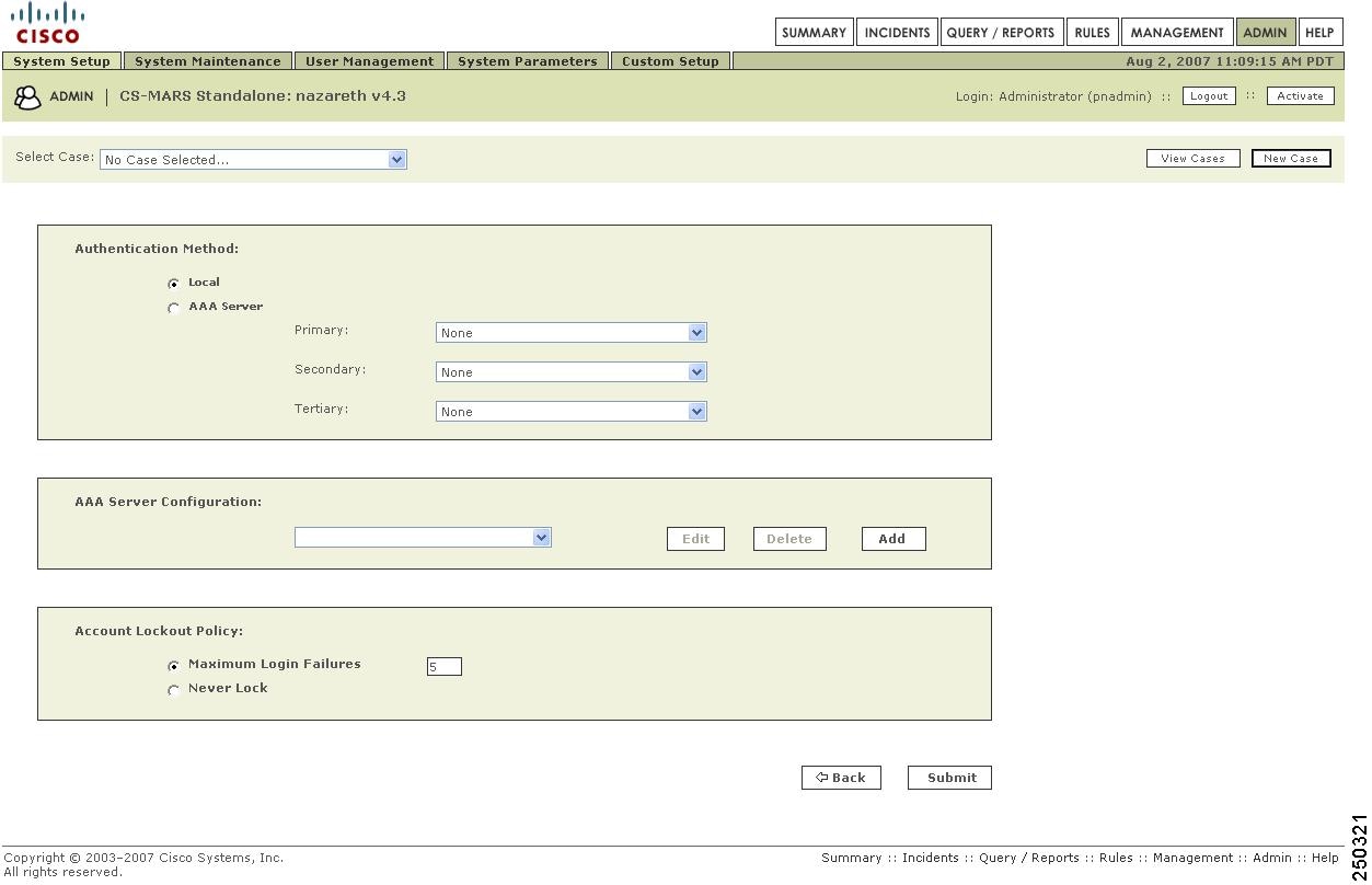 If the connectivity test succeeds, enter any User Name and Password configured for MARS on the AAA server and click Submit to verify that the added external AAA server correctly authenticates you to the MARS account.
