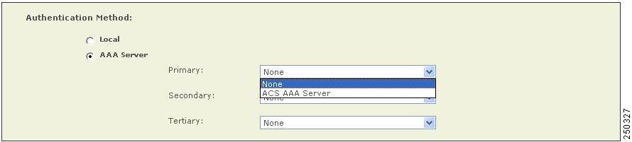In the Authentication Method box of the AAA Configuration Page, click the AAA Server radio button, and select your primary AAA server from the drop-down list. Select secondary and tertiary servers as appropriate to your network.