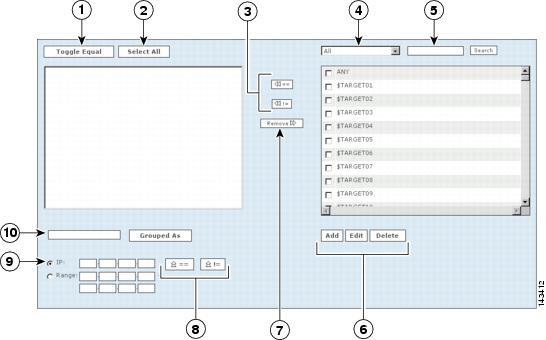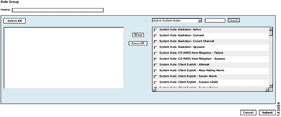 The Add Group dialog box appears, as shown in Figure 4-11. The rule group name appears in the Name field, and the included rules appear as selected rules in the lefthand pane of the dialog box.