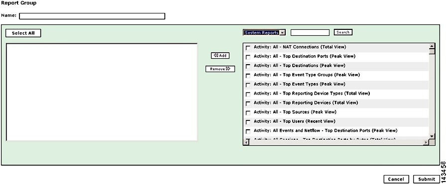 The Add Report Group dialog box appears, as shown in Figure 4-14. The report group name appears in the Name field, and the reports that are in the report group appear in the lefthand pane of the dialog box.