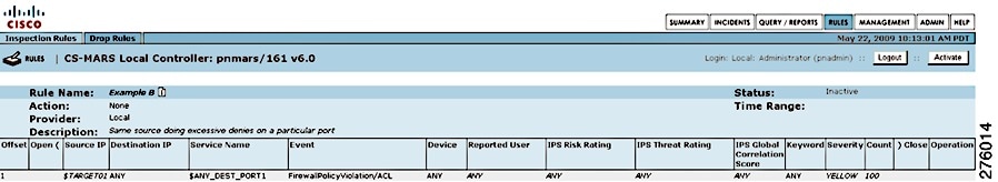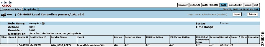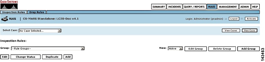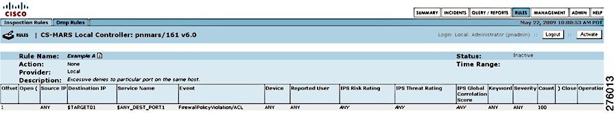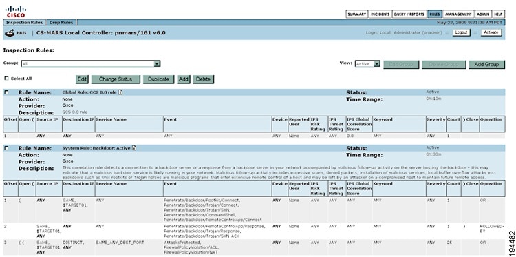 A rule is either active or inactive. Active means the rule is operating and is being applied to incoming events. Inactive indicates that the rule is inoperative and not consuming CS-MARS resources. For a list of all system inspection rules, see Appendix E, "System Rules and Reports".