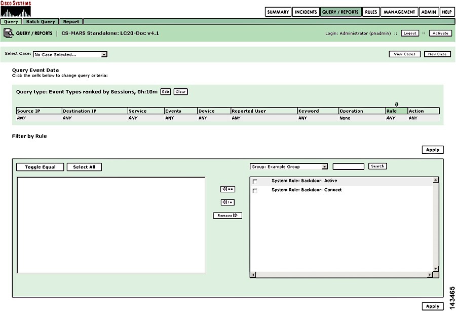 The selected rules appear in the Rules field of the Query Event Data bar.