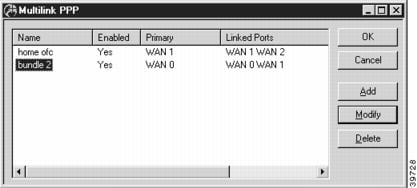 To access this dialog box, select Global/Multilink PPP from the Device View. This dialog box defines a list of MPPP bundles and the physical WAN ports that are included in each bundle.