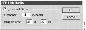 If the primary port goes down, the entire link will go down, even if MPQual is enabled. If left unchecked, any individual link in the bundle can bring down the entire multilink. (Parameters for echo packets are configured in the PPP Options/PPP Link Quality dialog box, see"PPP Options Dialog Box" section.)