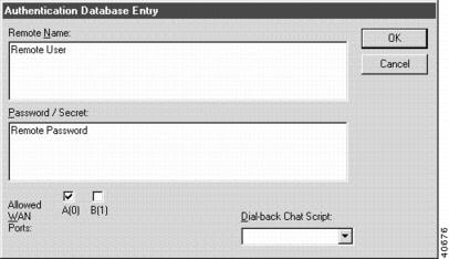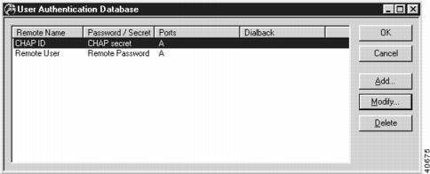 To add or modify database entries, you must access the Authentication Database Entry dialog box by selecting the Add... or Modify... buttons in the User Authentication Database Configuration dialog box (Figure 10-16).