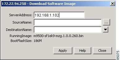 To download software images using the Fabric Manager, choose Admin > Download Software Image from the menu tree. To download software images using the Device Manager, choose Download Software Image from the Admin menu. Figure 6-2 shows the dialog box from the Device Manager.
