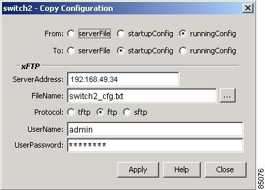 To copy configurations from the Fabric Manager, choose Admin > Copy Configuration from the menu tree. To copy configurations from the Device Manager, choose Copy Configuration from the Admin menu. Figure 6-3 shows the dialog box from the Device Manager.