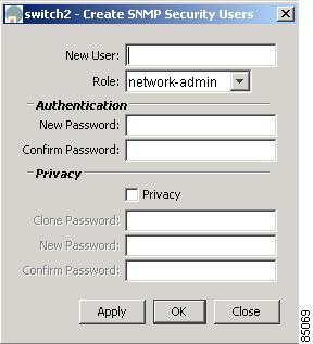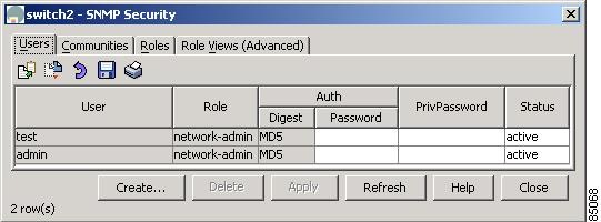 To view information about SNMP users, roles, and communities from Fabric Manager, choose Security > SNMP > Users on the menu tree. To view this information from the Device Manager, choose SNMP from the Security menu. Figure 5-1 shows the SNMP dialog box from the Device Manager.