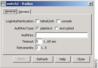 To configure RADIUS authentication from the Fabric Manager, choose Radius > General from the menu tree. To configure RADIUS authentication from the Device Manager, choose Radius (CLI) from the Security menu. Figure 5-7 shows the dialog box with the General tab selected from the Device Manager.