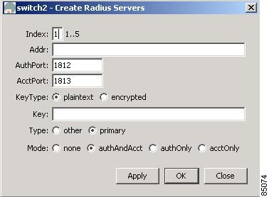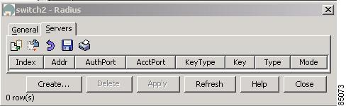 To add a Radius server, click Create on the Device Manager dialog box, or click the Create Row button on the Fabric Manager toolbar.