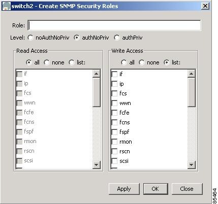 The Cisco Fabric Manager lets you control management access to Cisco MDS 9000 Family switches, whether you are using the command-line interface (CLI) or SNMP. The Cisco Fabric Manager uses SNMP to communicate remotely with switches. This chapter describes how to set up SNMP users and roles, and how to assign different administrative privileges to different roles.