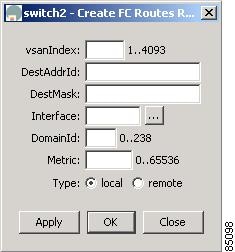 To configure Fibre Channel routes from the Device Manager, choose Routes from the FC menu. The dialog box displays routes for a single switch. Figure 10-1 shows the dialog box.