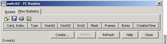 To view Fibre Channel flows from the Fabric Manager, choose FC > Route Flow Statistics on the menu tree. To manage Fibre Channel route flows from the Device View, choose Routes from the FC menu and click the Flow Statistics tab.