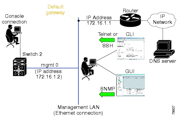 In-band management—This feature provides IP over Fibre Channel (IPFC) to manage the switches. The in-band management feature is transparent to the network management system (NMS). Instead of conventional Ethernet physical media, switches in the Cisco MDS 9000 Family use IPFC as the transport mechanism (see Figure 3-1 and "Configuring IP Services").